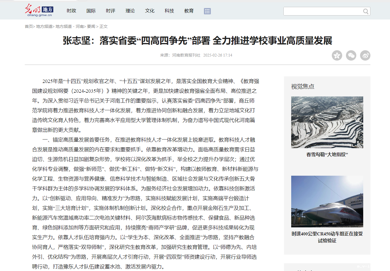 近日,光明网、大象网、省教育厅官网等多家媒体转发张志坚署名文章《落实省委“四高四争先”部署 全力推进学校事业高质量发展》,社会反映良好。